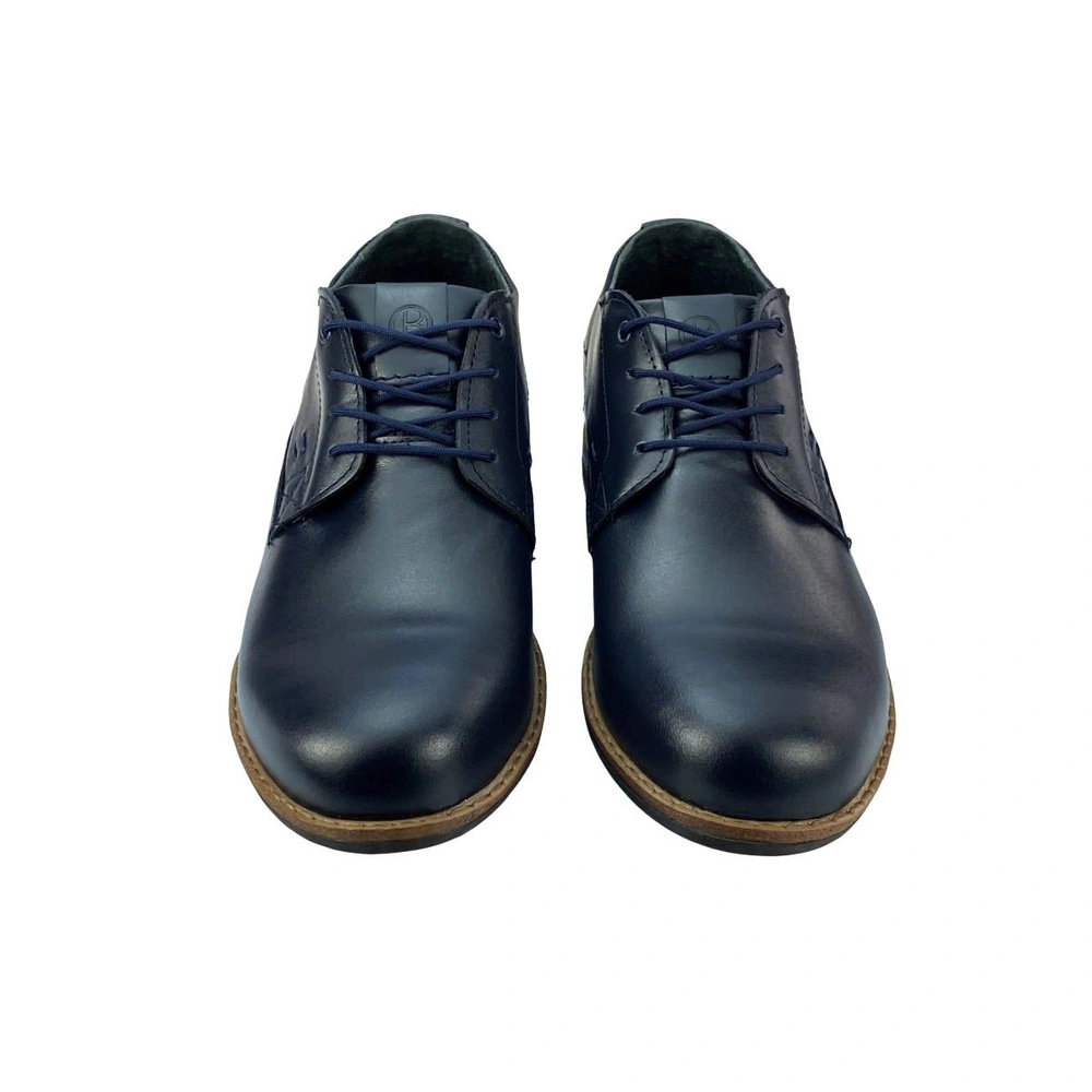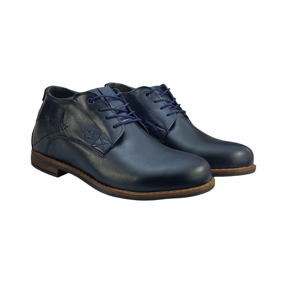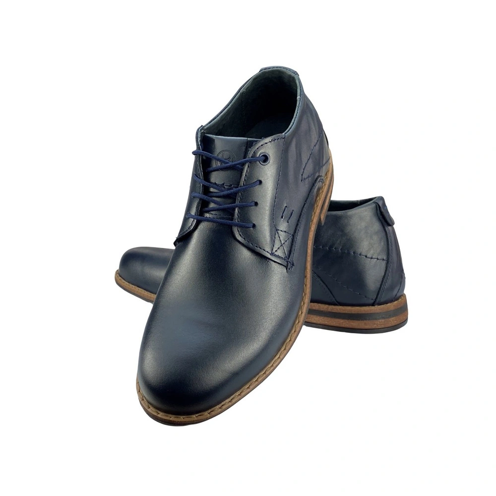 Fabriquées à la main en cuir véritable bleu marine, ces chaussures rehaussantes reposent sur une semelle marron.